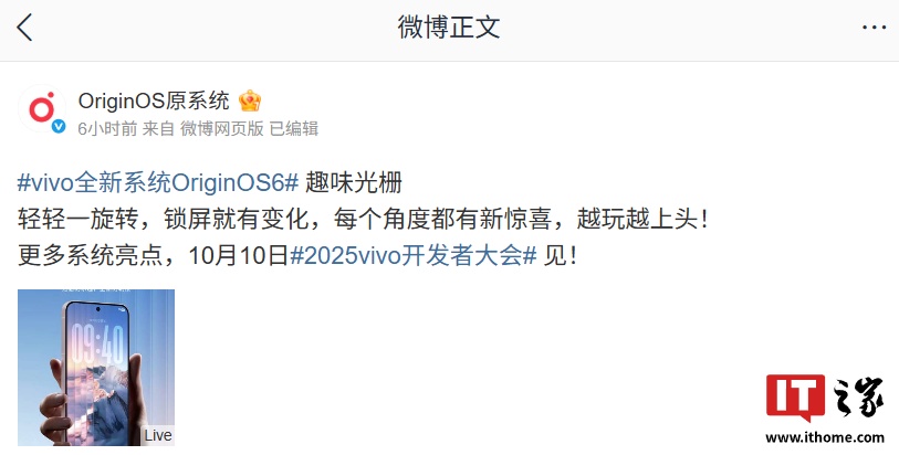 IT之家 9 月 30 日消息,vivo 手机操作系统官方微博 @OriginOS 今日透露了 OriginOS 6 的新特性 —— 趣味光栅。据官方描述“轻轻一旋转,锁屏就有变化,每个角度都有新惊喜”。