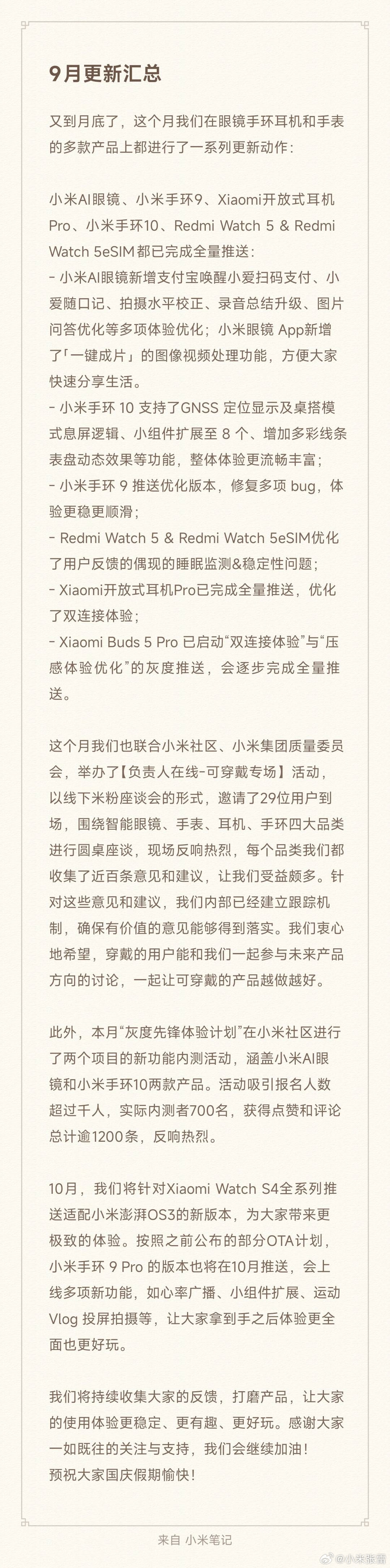 IT之家 9 月 30 日消息,小米集团手机部副总裁、可穿戴部总经理张雷今日发文“汇报”了小米可穿戴设备的升级更新情况,他称小米 AI 眼镜、小米手环 9、Xiaomi 开放式耳机 Pro、小米手环 10、REDMI Watch 5 & REDMI Watch 5 eSIM 都已完成全量推送: