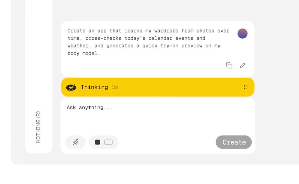 Nothing Playground演示画面,正在创建一个应用以提供穿着建议。Nothing
