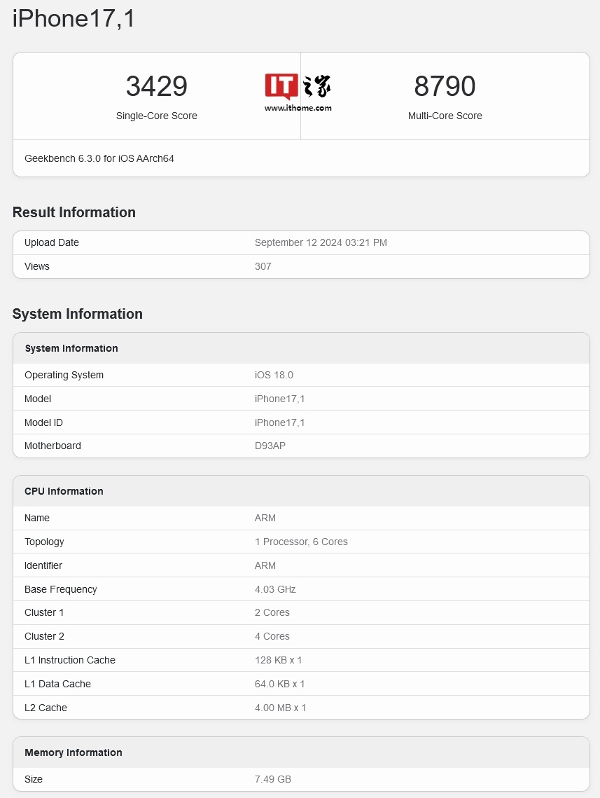 IT之家注:基准测试只是基准测试,并不总能准确反映实际性能,具体还要等待新 iPhone 16 机型发售之后实测才能更深入了解。