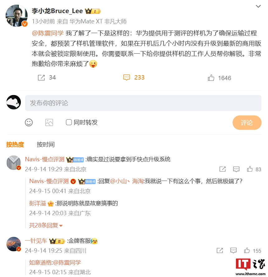 被用户称作“金牌客服”的华为终端 BG CTO 李小龙昨日发文对该情况进行解答: