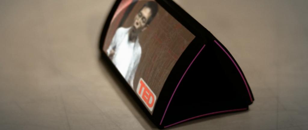 在设想中,这款名为「Flip」的三折手机可以把屏幕当成键盘,或者电子阅读器,比较特别的是它可以「卷起来」成为一个三棱柱形态放在桌上,充当一个媒体播放器