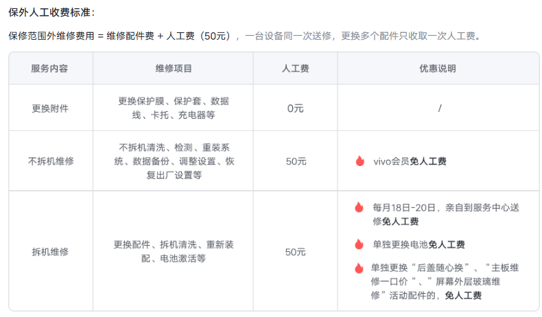 需要注意的是,保修范围外维修费用 = 维修配件费 + 人工费(50 元),一台设备同一次送修,更换多个配件只收取一次人工费。