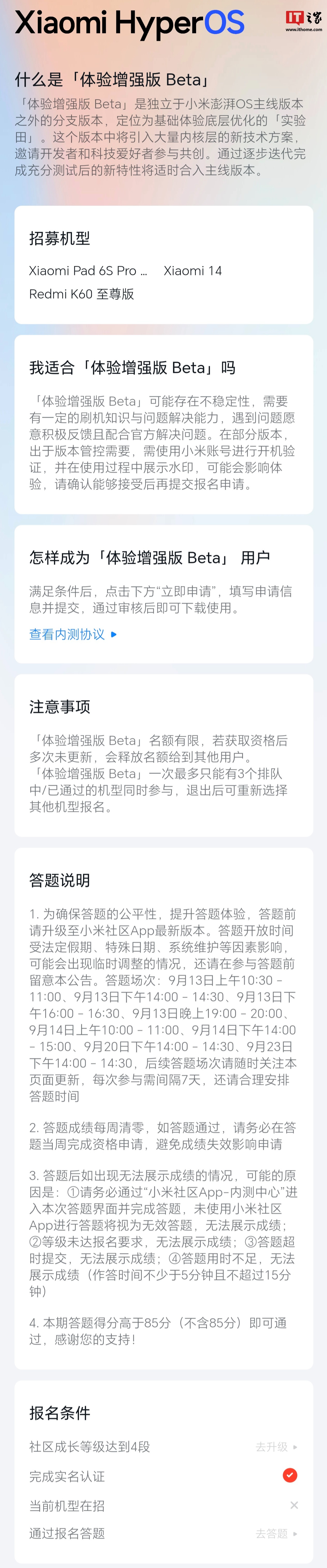 小米官方现公布澎湃 OS 体验增强版 Beta 更多答题时间,新增 9 月 20 日和 9 月 23 日,IT之家整理此次招募详情如下: