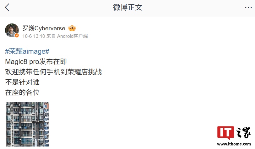 IT之家 10 月 7 日消息,荣耀首席影像工程师罗巍昨日发文称,Magic8 Pro 发布在即,欢迎携带任何手机到荣耀店挑战。而罗巍微博的话题为“荣耀 aimage”,暗指荣耀 Magic8 Pro 手机在影像上有所突破,不惧其他机型挑战。