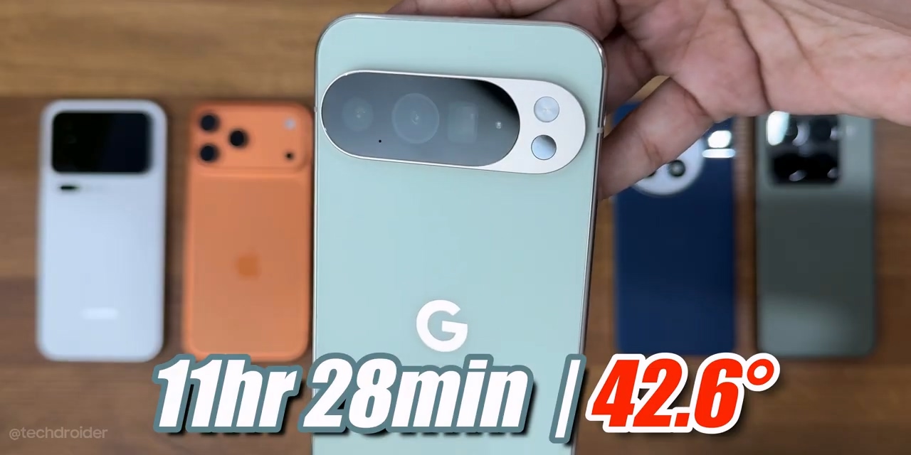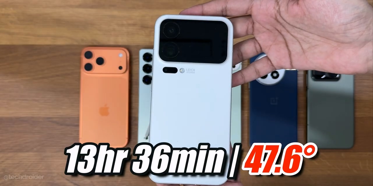 TechDroider 的极限续航测试模拟了高强度使用场景,包括 3 小时游戏、3 小时视频播放、1.5 小时网页浏览、1.5 小时社交媒体使用,以及持续拍摄 4K 视频直至电量耗尽。