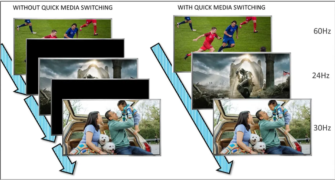 快速媒体切换是一种基于HDMI 2.1a设计的简化方法,使电视在不同内容的刷新率之间切换时保持流畅播放。虽然对大多数人来说这种切换非常微妙且不易察觉,但通常在这些模式之间切换时,会出现黑屏,实质上是在重启刷新率。