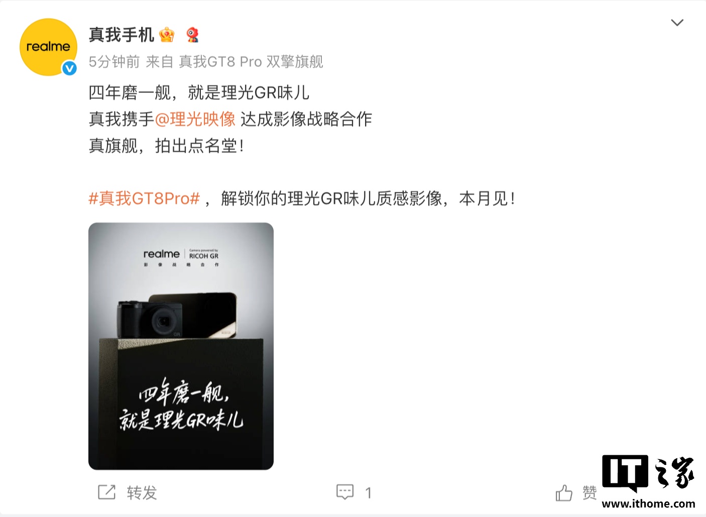 IT之家 10 月 9 日消息,真我 realme 副总裁、全球营销总裁、中国区总裁 @徐起Chase 今天上午宣布,真我与理光映像正式达成影像战略合作。
