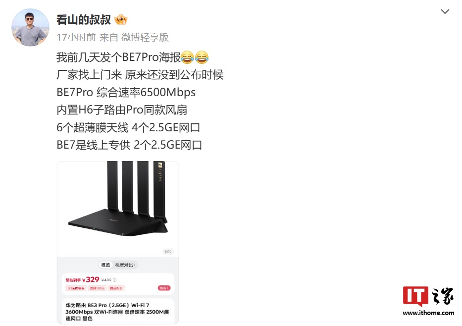 IT之家 9 月 16 日消息,博主 @看山的叔叔 昨日发文爆料,华为路由 BE7 Pro 综合速率 6500Mbps,内置 H6 子路由 Pro 同款风扇,配备 6 个超薄膜天线 + 4 个 2.5GE 网口。华为路由 BE7 是线上专供,拥有 2 个 2.5GE 网口。