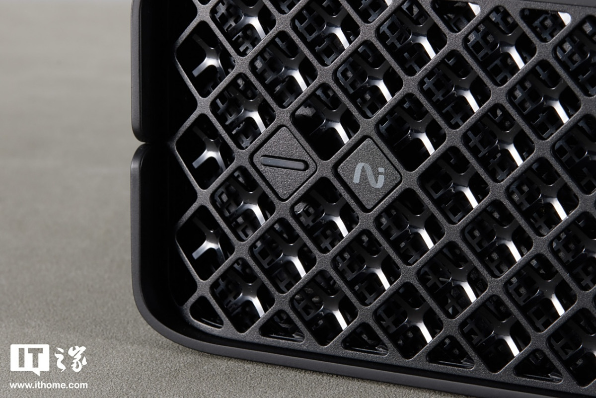 前面板采用大面积棱形格栅外开孔,内部则是一组亮面凹陷处理的棱形格栅,两侧遥相呼应在光线照射下很有质感,好似经过了金属 CNC 切削一样,最里面还有一层更小开孔的金属格栅用于散热。