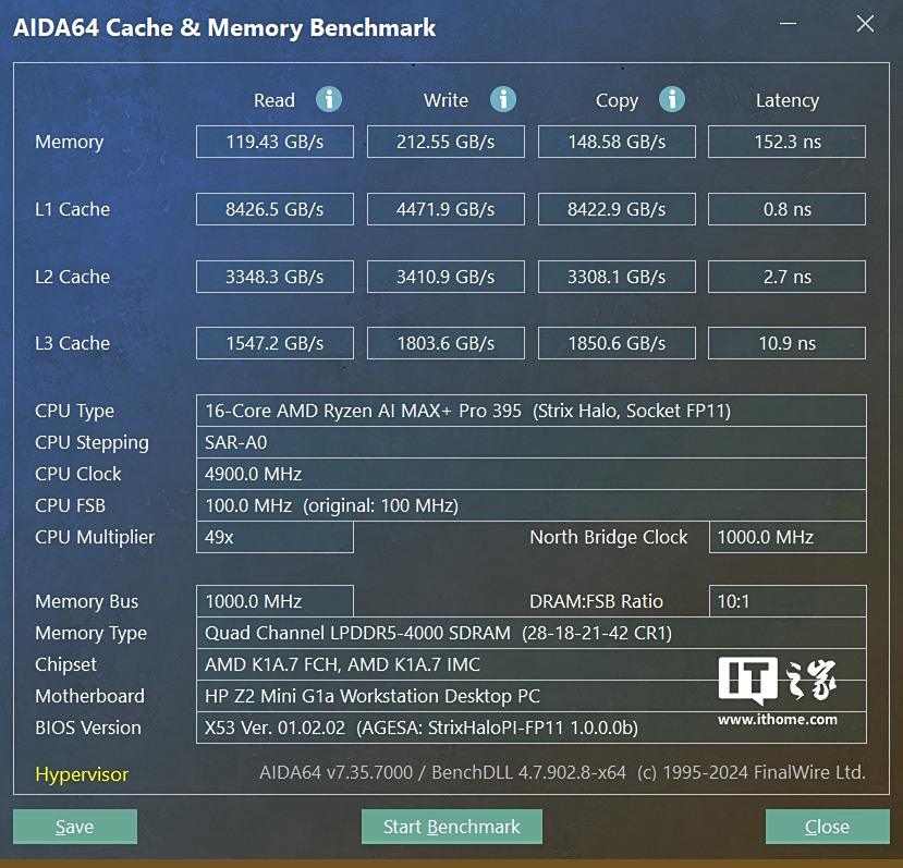 惠普 Z2 Mini G1a 迷你 AI 工作站的最大看点,自然是其搭载的 AMD“Strix Halo”系列旗舰芯片 —— 锐龙 AI Max+ PRO 395,它采用创新的 Zen 5 架构和领先的台积电 4nm FinFET 工艺打造,拥有 16 颗超大核 32 线程设计,基础频率 3.0GHz,最高加速频率 5.1GHz,配备 80MB 的(L2+L3)大缓存,默认 TDP 低至 55W,可配置热设计功耗 45-120W,兼顾性能和能耗方面的需求,非常适合小体积的台式工作站搭载,而且规格上已经是个人桌面级消费 PC 的最高级别。