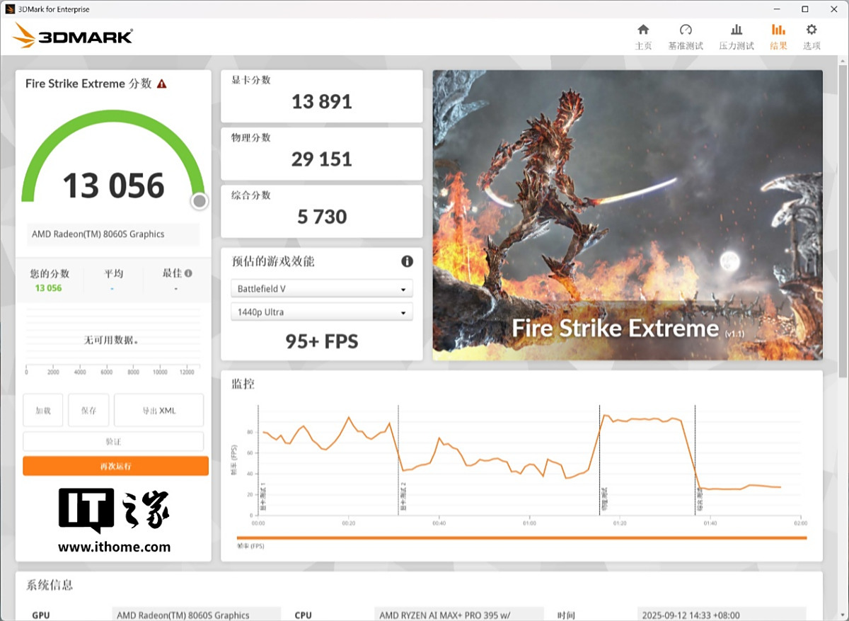 在 3D Mark Fire Strike Extreme 项目中,显卡成绩达到了 13891 分,相比桌面端 RTX 4060 显卡同样高出了几百分。