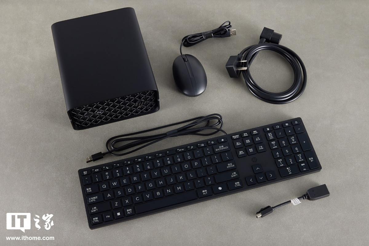 配件方面,惠普 Z2 Mini G1a 迷你 AI 工作站提供了一根三角插头电源线、一副有线键鼠套装以及一根 Mini DP to DP 口转接线。