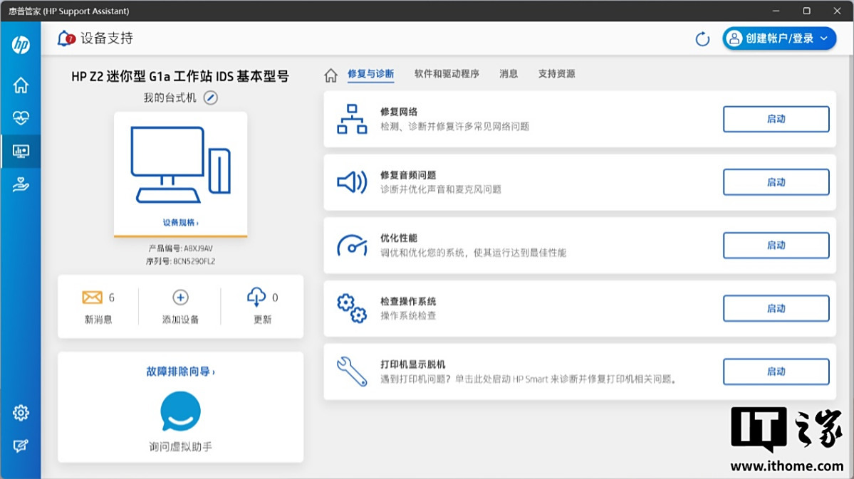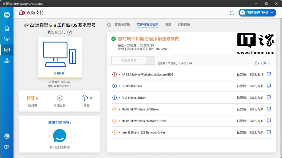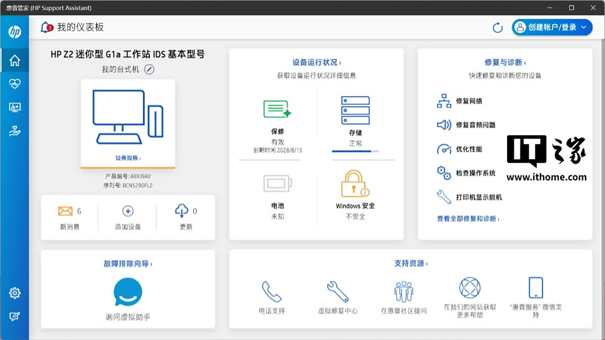 惠普 Z2 Mini G1a 迷你 AI 工作站内置了惠普管家应用程序,主页可轻松查看设备基本信息,包括产品序列号、保修期、存储状况和驱动更新提醒等。我们手上的这台机器拥有 3 年基本保修,当然消费者在购买时也可以通过官网和电话渠道了解更多售后支持服务。