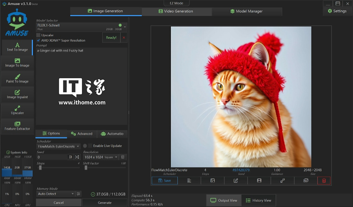 测试借助 Amuse 3.1.0 这款软件来加载本地的模型,作为 AMD 的合作伙伴之一,Amuse 针对 AMD 平台的 AI 性能进行了深度优化,特别是支持 AMD XDNA Super Resolution 功能,可以在文生图时利用 AMD 平台 NPU 的能力对生成的图片进行超分到 2 倍分辨率,作为这个项目的测试工具非常合适。