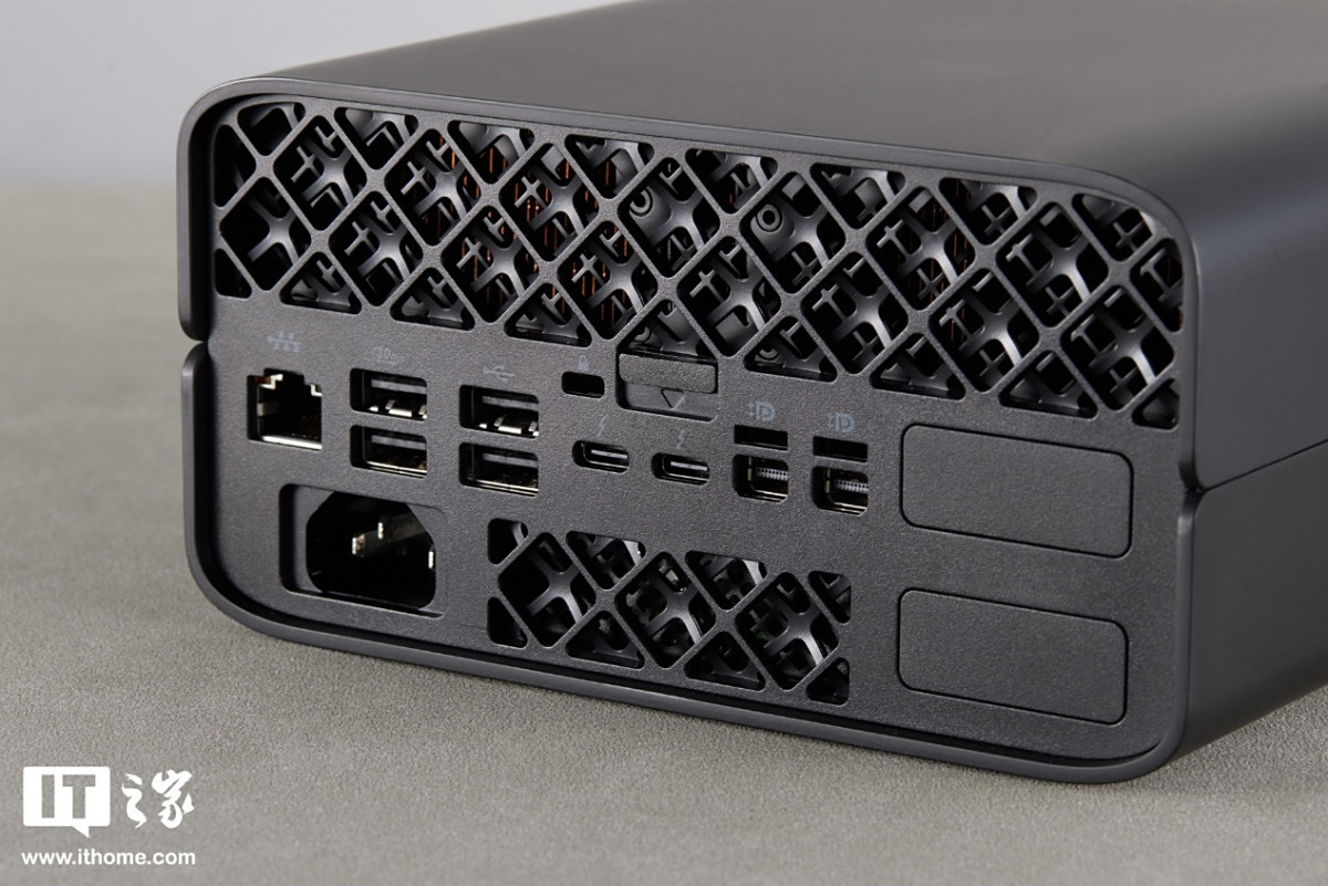 机身背部的上方也提供了棱形格栅设计,用于出风散热。下方则是丰富的接口,从左到右依次是一个 2.5 千兆以太网口、一个电源接口、两个 10G 速率的 USB-A 接口、两个 USB-A 2.0 接口、一个防盗锁孔、一个免工具侧盖下拉开孔、两个 40G 速率高速雷电 4 的 USB Type-C 接口、一个快捷闩锁、两个 Mini DP2.1 UHBR10 接口、两个 Flex IO 接口(带挡板),用户可以根据自身需求选配串口、额外 USB 接口或 2.5G 网口甚至 10G 万兆网口,接口类型非常全,便于用户进行外接拓展。