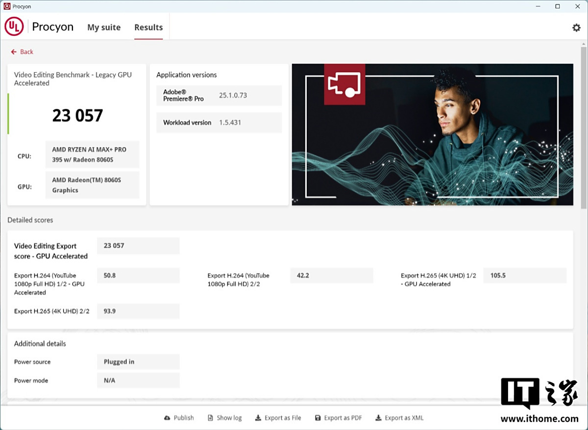 而在 UL Procyon 视频编辑基准测试中,AMD 锐龙 AI Max+ PRO 395 处理器综合分数来到了 23057 分,非常强悍。