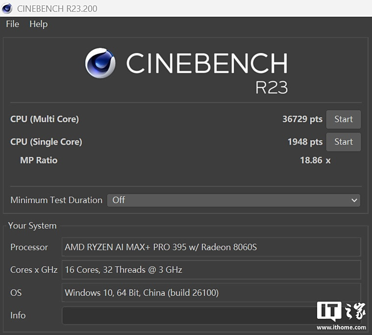 接下来就是理论跑分了,首先是 CineBench R23,锐龙 AI Max+ PRO 395 处理器获得了单核 1948 分,多核 36729 分的成绩。