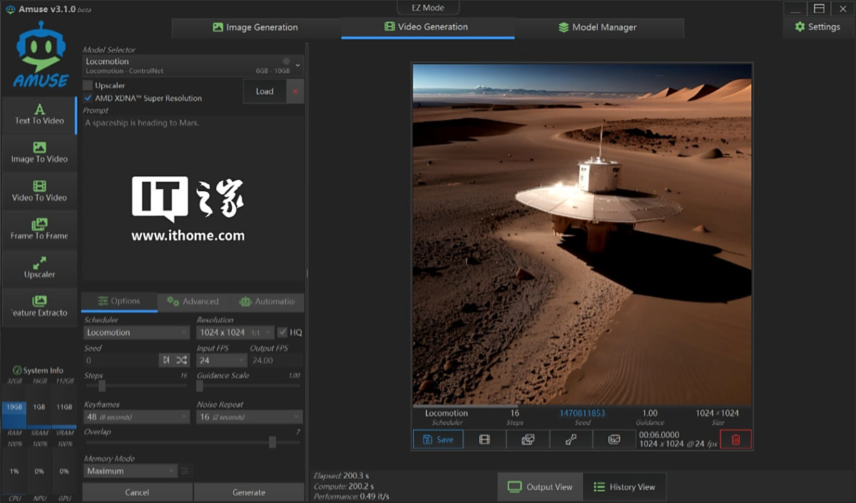 接着是文生视频表现,这次我们使用大小为 6GB 的 Locomotion 模型,提示词为:“一艘宇宙飞船正赶往火星”,视频输出分辨率为 1024*1024,视频时长为 6s。