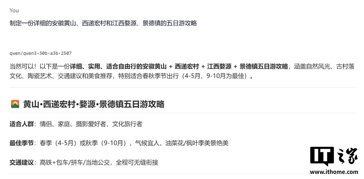 第一步我们尝试一个参数量较小的 Qwen3 30B A3B 2507 模型,其模型包体大小达到了 17.28GB,加载该模型后让其提供一份较为详细的安徽(黄山・西递宏村)+ 江西(婺源・景德镇)的五日游攻略。