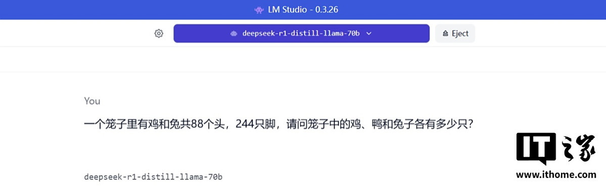 接着,我们切换到模型参数量更大的 DeepSeek R1 Distill Llama 70B 模型,并提问了一个经典数学问题「鸡兔同笼」,并且故意在里面加入一个干扰条件,问大模型鸭子有多少只,看看它会不会被干扰。