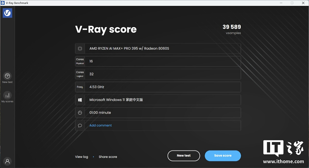 在 3D 渲染专业工具 V-Ray Benchmark 6 基准测试中,AMD 锐龙 AI Max+ PRO 395 处理器的 CPU 项目分数为 39589 分。