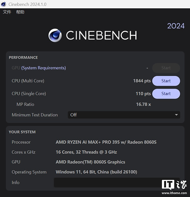 在 CineBench 2024 中,锐龙 AI Max+ PRO 395 处理器的单核成绩为 110 分,多核成绩为 1844 分。