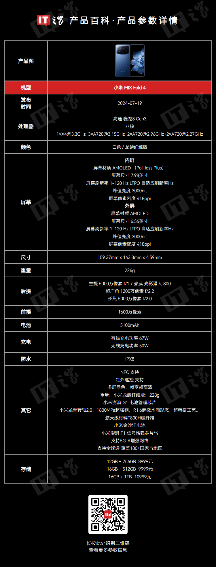 小米 MIX Fold4 折叠屏手机发布于今年 7 月,该机搭载高通骁龙 8 Gen3 处理器,配备 LPDDR5X 内存 + UFS 4.0 闪存,拥有 7.98 英寸内屏( 2488×2224 分辨率、120Hz LTPO) + 6.56 英寸外屏(2520×1080 分辨率、120Hz LTPO 高刷)。