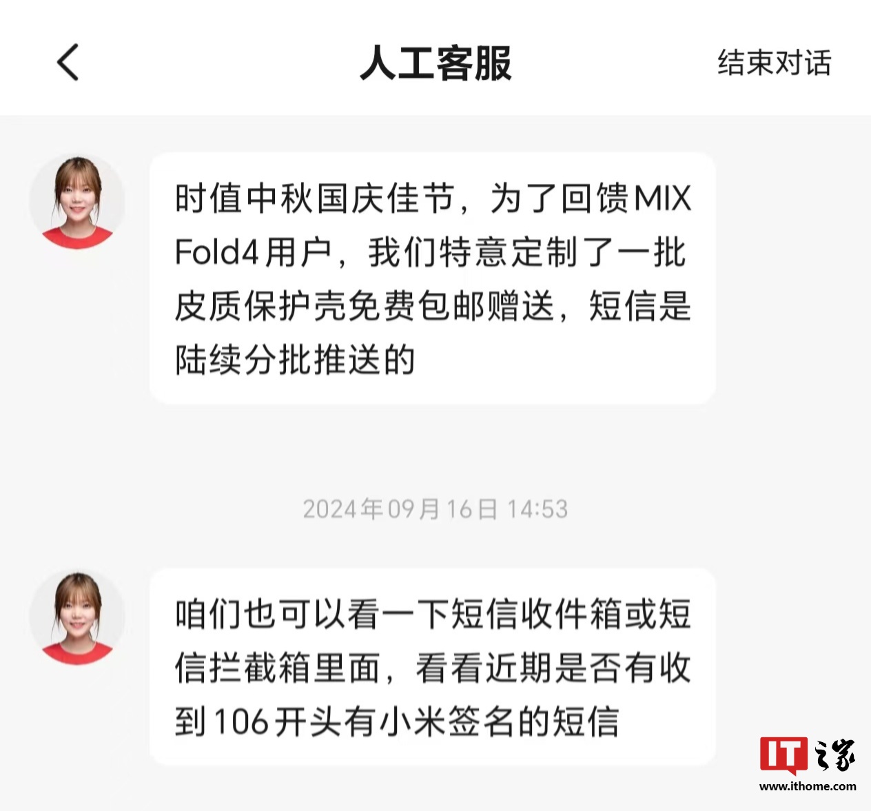 IT之家从小米官方客服处获悉,此次活动采取短信推送的形式进行,使用 MIX Fold4 折叠屏手机的用户会收到 106 开头有小米签名的短信,短信内会带有活动链接。