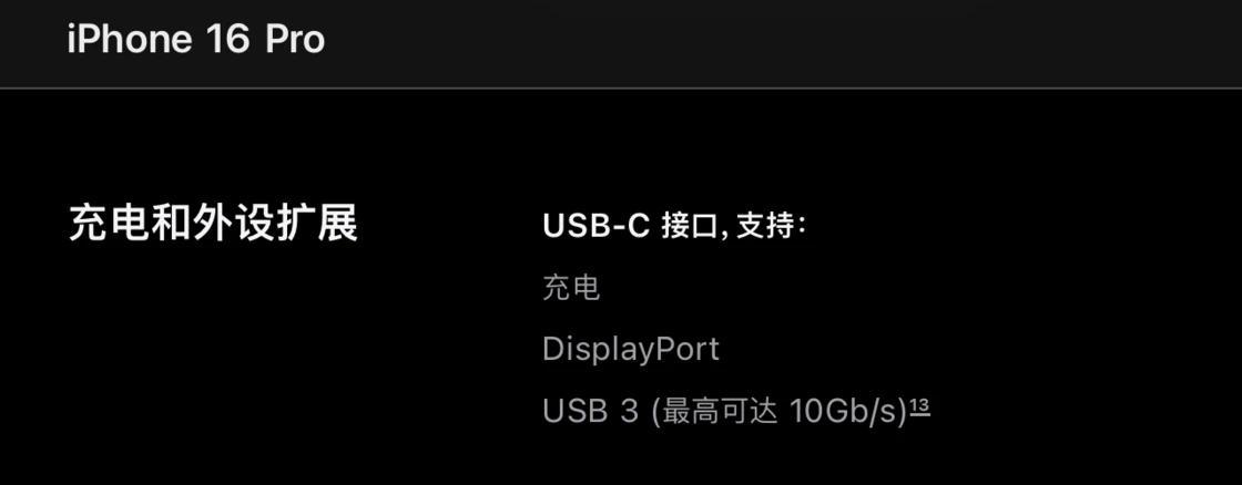 今年的 iPhone 16 和 16 Plus 仍保持 USB 2.0 速率;而发布会上被标注为支持更快速率 USB 3 的 A18 Pro 芯片,实际上 iPhone 16 Pro 和 Pro Max 的 USB-C 速率仍为 10Gb/s。