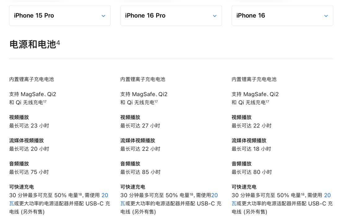 电池方面,得益于 iPhone 16 全系列更大的电池,让续航有了显著提升;不过也因为更大的电池让 20W 充电器无法在 30 分钟内将 iPhone 16 Pro Max 系列充至 50%,需要 35 分钟。另外,根据目前中国质量质量认证中心关于新手机的充电细节的曝光,iPhone 16 系列可能全系支持最大 15V 3A 也就是最高 45W 的充电速度。不过,有博主测试后 iPhone 16 系列最大充电速度为 35W。