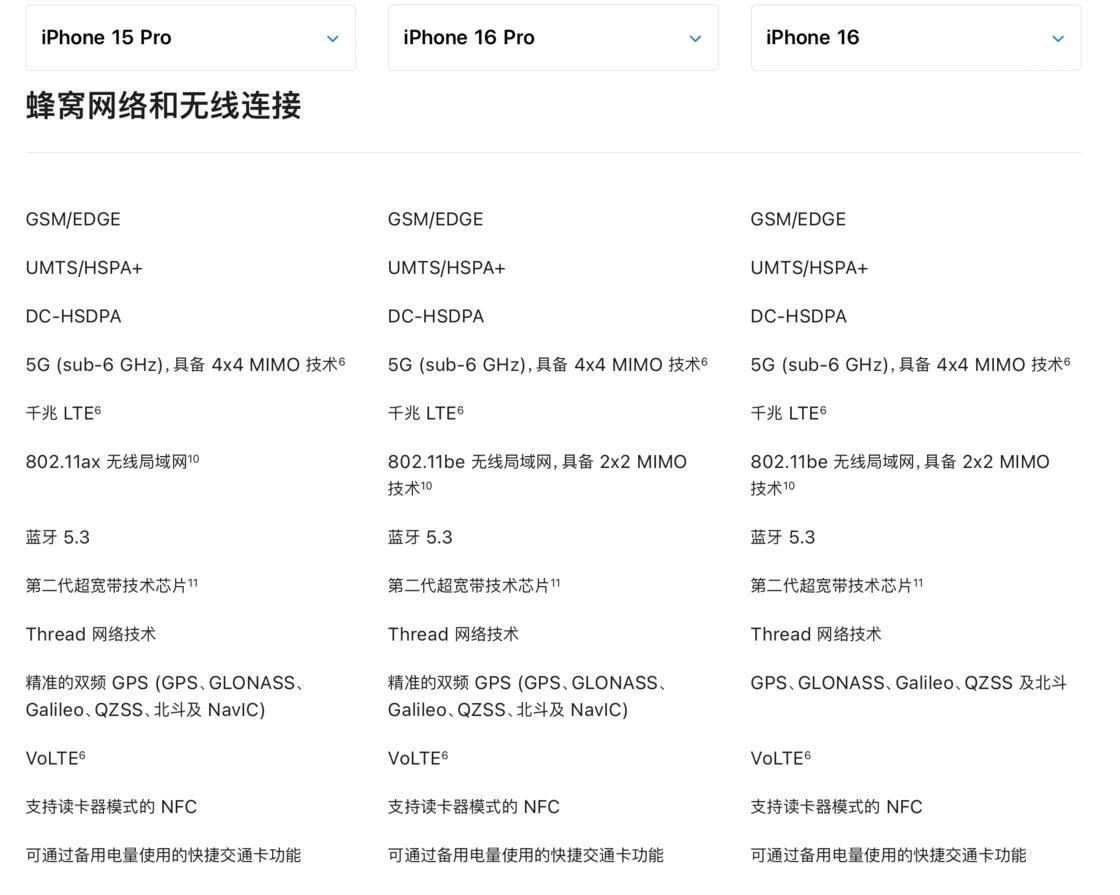 在 5G 网络方面,iPhone 16 全系列和前代参数一致,只有美版 iPhone 毫米波技术,其他地区均支持 Sub-6GHz,但在频段上仍有些许差异。至于无线网络方面,iPhone 16 全系列都支持 Wi-Fi 7。不过 Apple 强调「Wi-Fi 6E 和 Wi-Fi 7 仅适用于支持此功能的国家或地区」,所以具体情况还取决于各地的网络规划和安排。