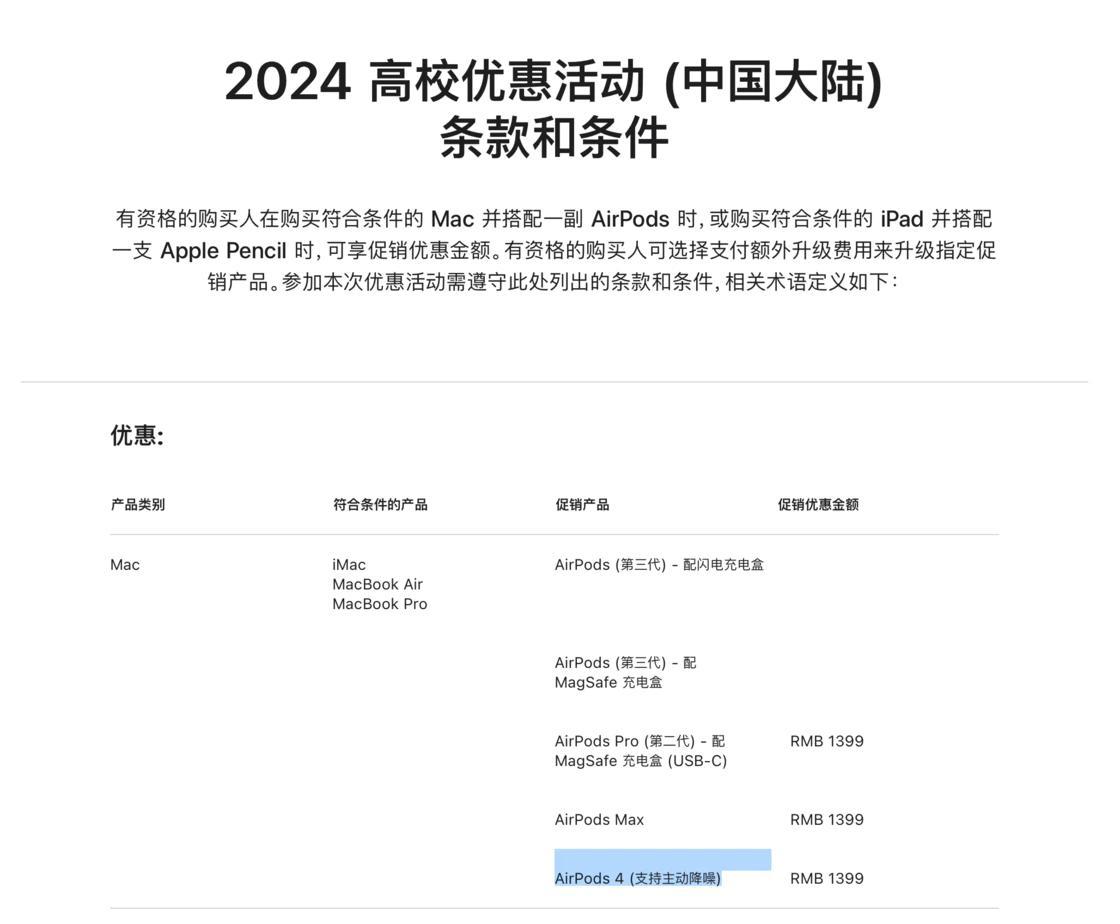而且如果是高校师生,那么现在通过教育优惠买 iPad 或 Mac 也是值得考虑的,因为现在教育优惠中送的耳机边变成 AirPods 4(支持主动降噪)款。