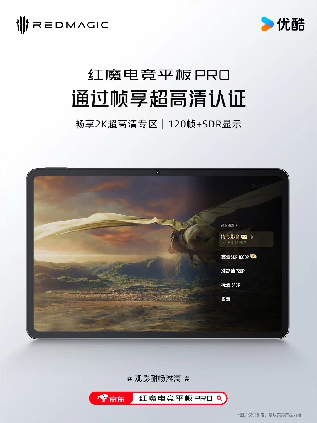 红魔官方于 9 月 13 日宣布,红魔电竞平板 Pro 通过优酷帧享超高清认证,可观看 2K 超高清专区视频内容,支持 120 帧 + SDR 显示。