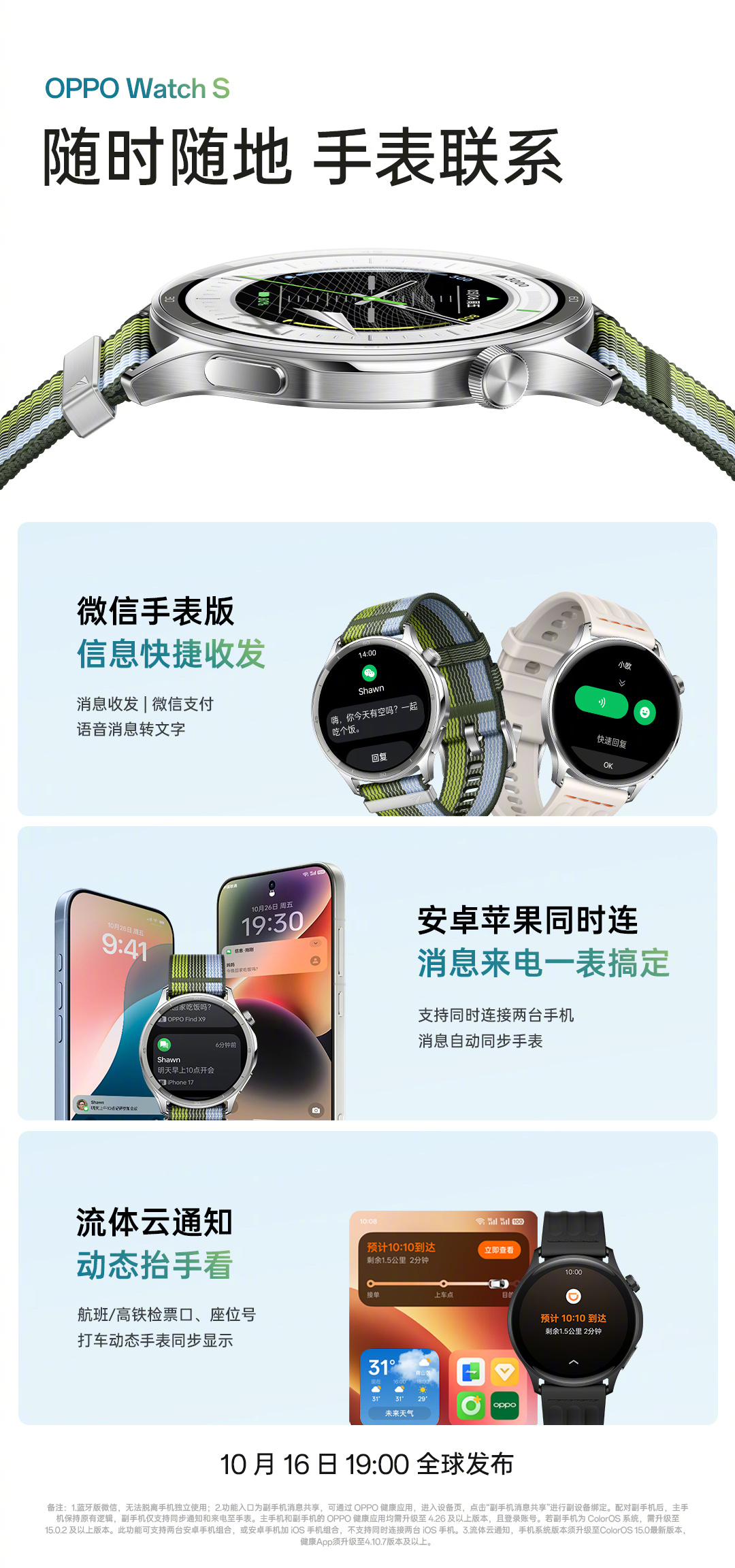 IT之家 10 月 11 日消息,OPPO Watch S 将于 10 月 16 日 19:00 全球发布,号称“轻薄表皇”,官方今日介绍了新品的部分功能。