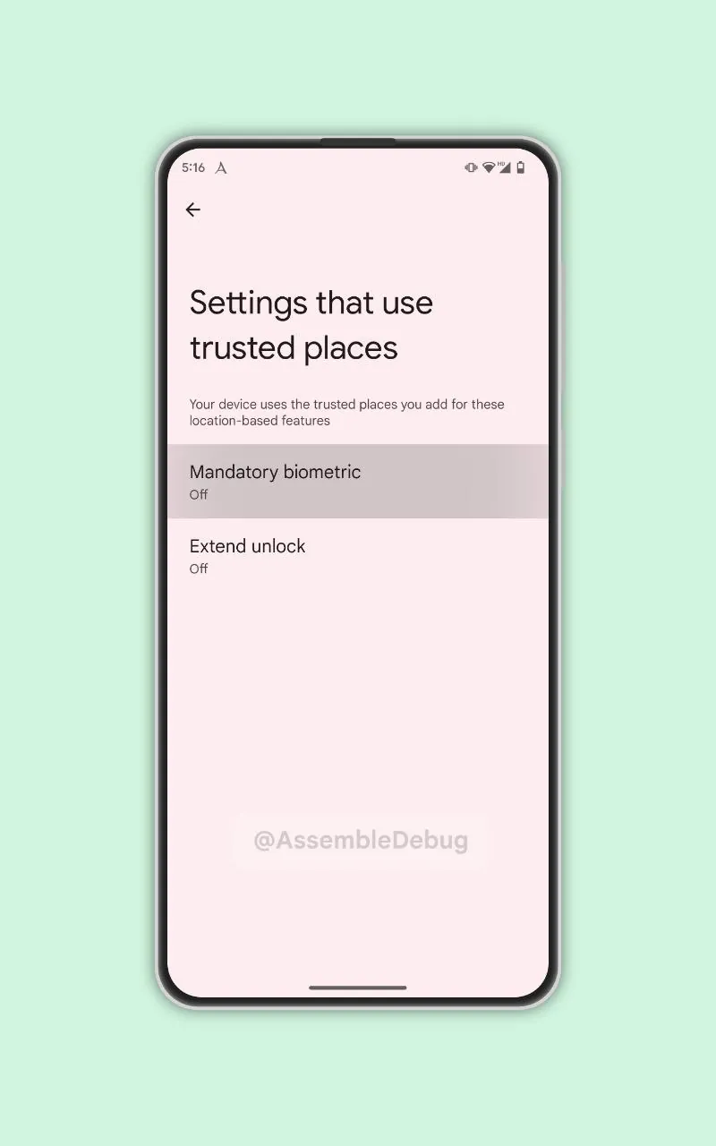 不仅于此,另外的截图显示谷歌正在升级其“可信位置”功能 —— 当手机位于可信位置(如家中)时,会保持解锁,并添加一个新的“强制生物识别”选项。