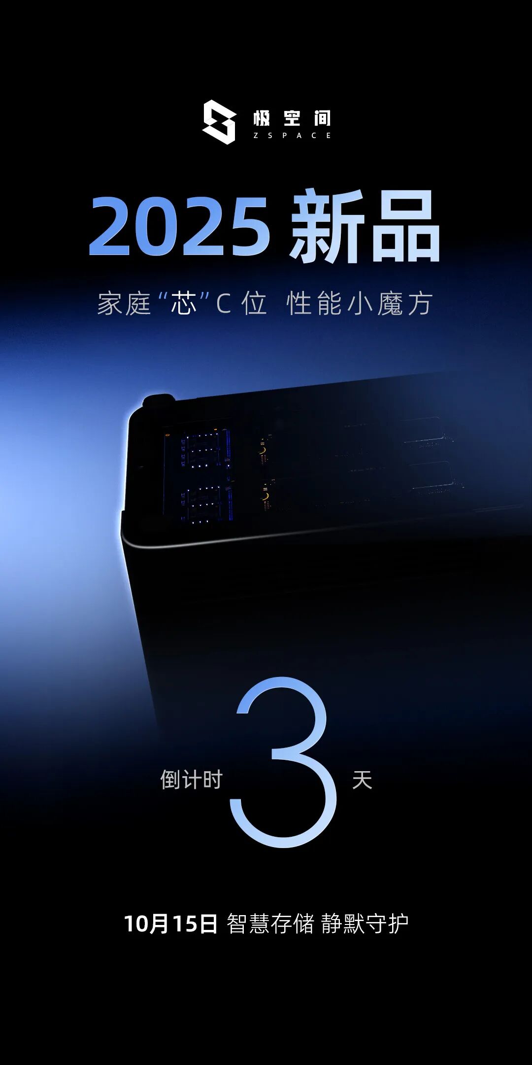 IT之家 10 月 12 日消息,极空间今晚宣布 2025 新品将于 10 月 15 日发布,slogan 为智慧存储静默守护,号称家庭“芯”C 位、性能小魔方。从海报来看似乎是一款两盘位的家庭存储产品。
