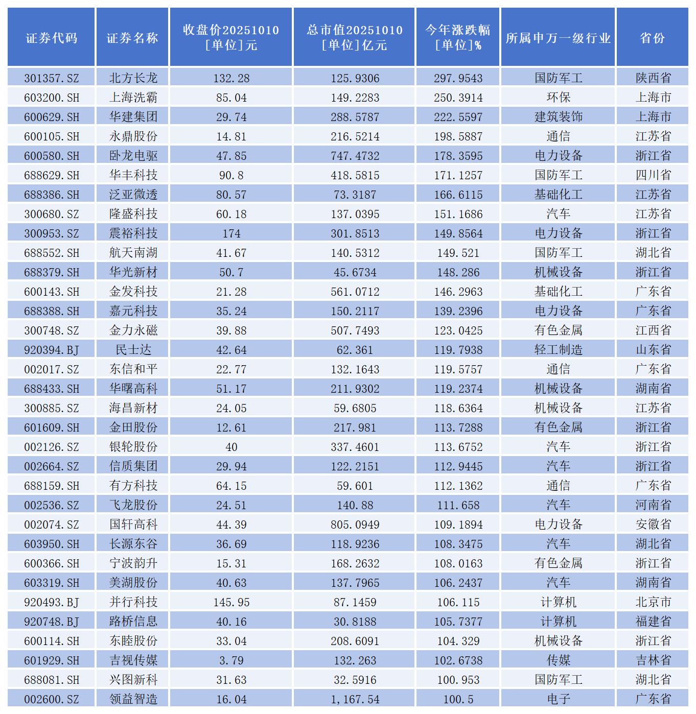 从二级市场表现看,截至10月10日收盘,今年以来,已有33家上市公司股价成功实现翻倍。其中,北方长龙(301357.SZ)、上海洗霸(603200.SH)、华建集团(600629.SH)3家公司股价涨幅均超过200%。