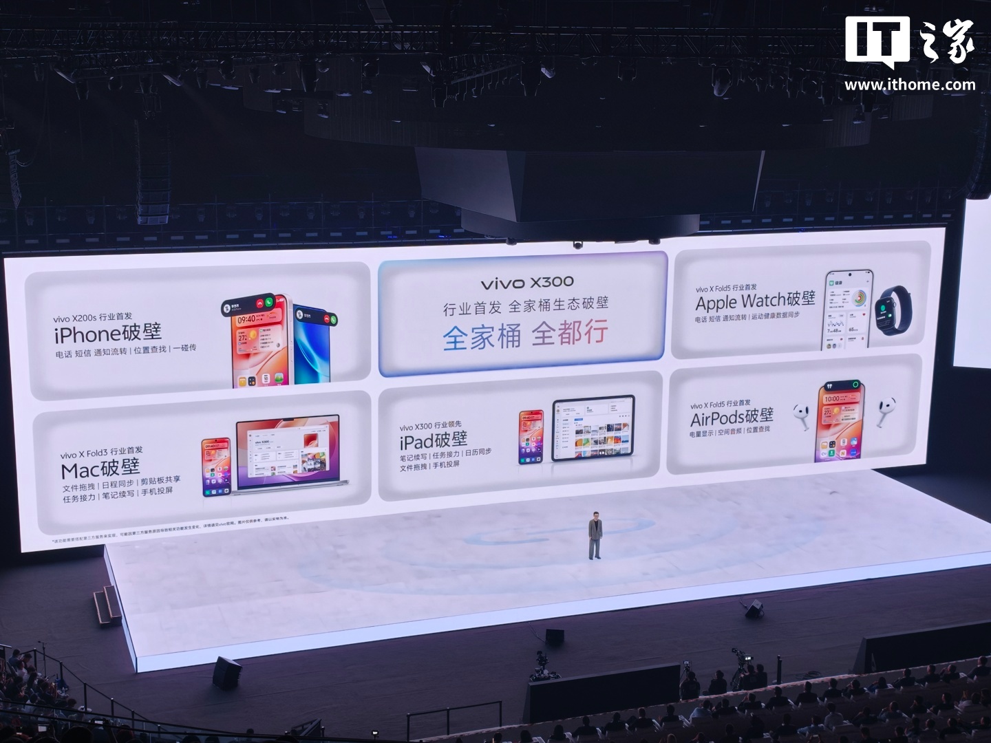 IT之家 10 月 13 日消息,vivo X300 系列新品发布会正在进行中,官方在发布会中亮相了行业首发的“全家桶生态破壁”方案,可互通“苹果全家桶”设备。