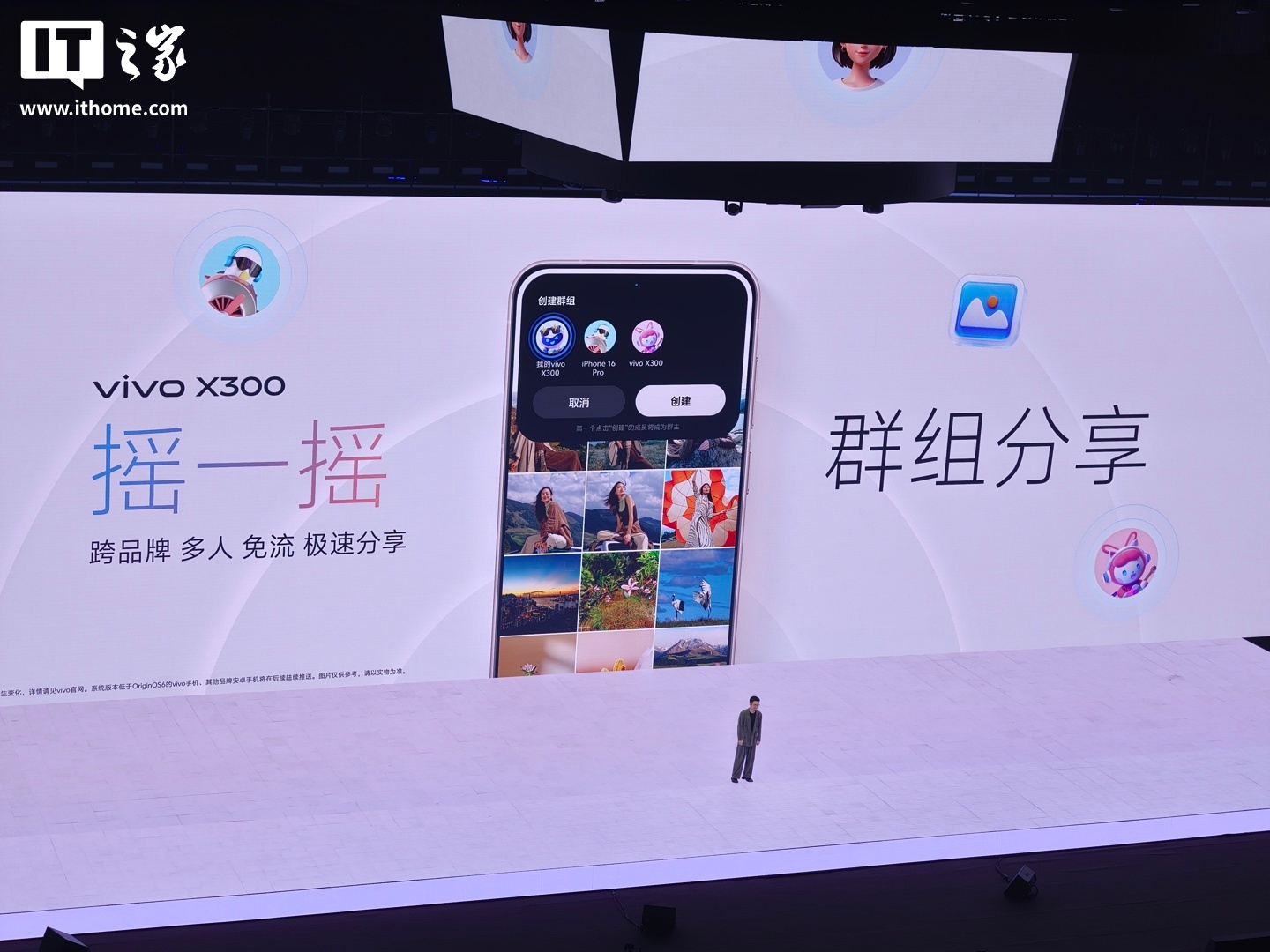 此外,vivo X300 系列手机还支持“摇一摇”跨品牌群组分享,可以直接在手机上摇一摇建立分享群,实现跨品牌秒传大文件、照片等,在团建、家庭聚会等场合时可以直接一对多发照片,解决以前“一碰传”只能一对一传送的痛点。