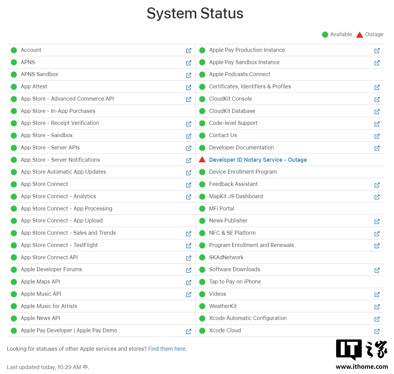 苹果开发者系统状态页面显示,Developer ID Notary Service 处于中断状态。