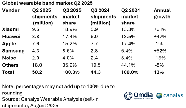具体到厂商来看,2025年第二季度全球可穿戴腕带设备市场出货量前五分别为小米、华为、苹果、三星、Noise(印度可穿戴品牌)。