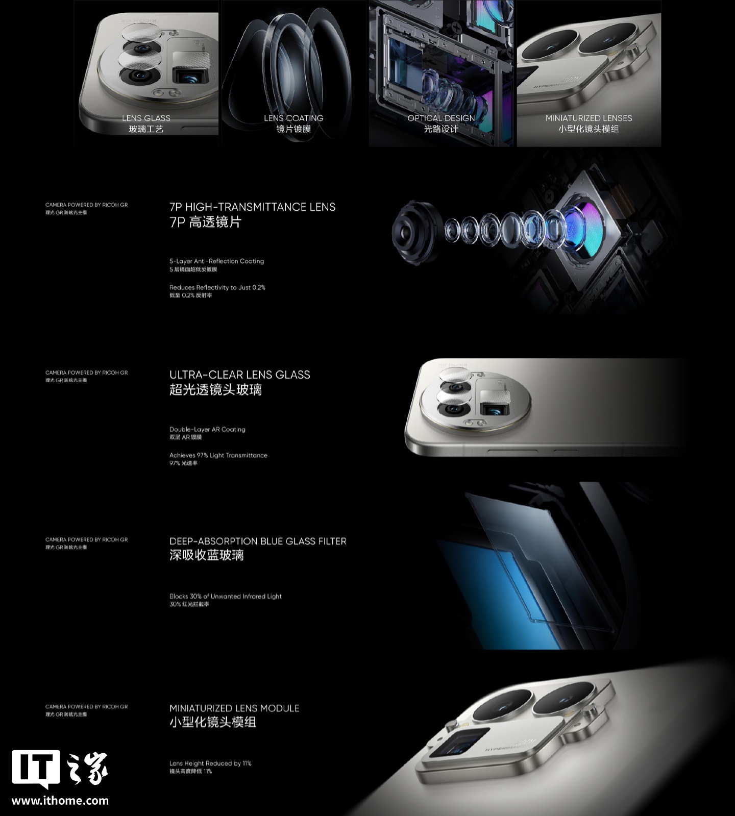 同时,相应手机主摄搭载 1/1.56 英寸 50MP 传感器,匹配“首个通过理光 GR 光学标准认证的手机镜头”,并且经过理光 GR 团队严格验收,其采用 7P 高透镜片、5 层超低反镀膜,内置直觉算法引擎,支持 10-Bit 色彩、超光感 HDR 算法。