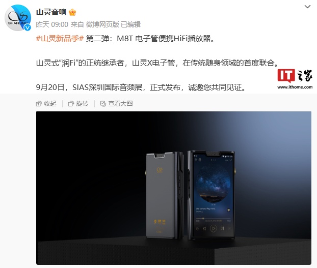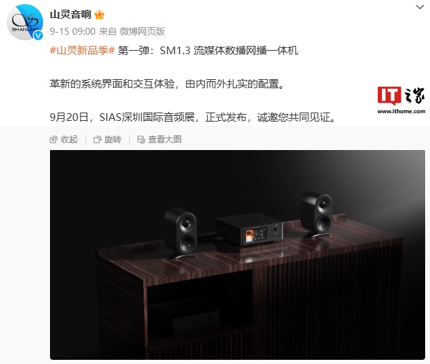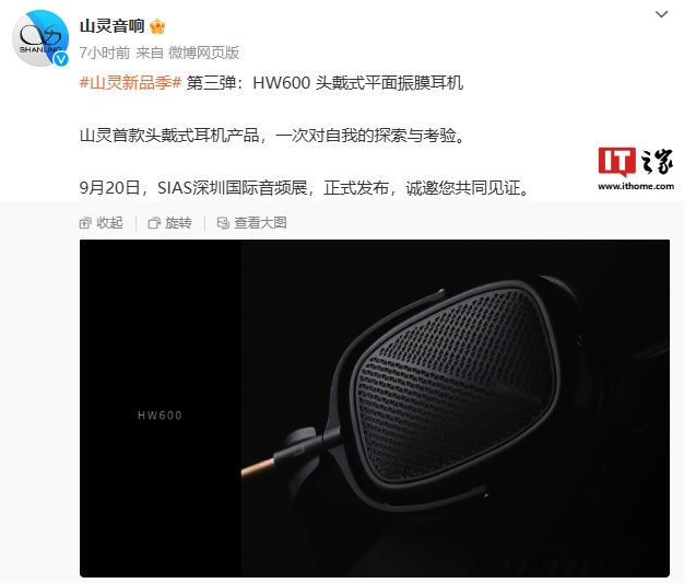 IT之家 9 月 17 日消息,山灵音响近日开启新品预热,含 HW600 头戴式平面振膜耳机、M8T 电子管便携 HiFi 播放器和 SM1.3 流媒体数播网播一体机等。新品将于 9 月 20 日在 SIAS 深圳国际音频展正式发布。