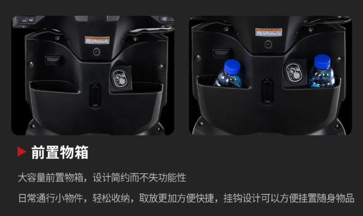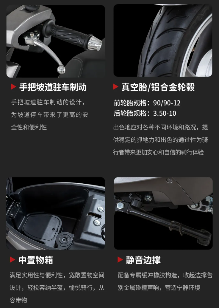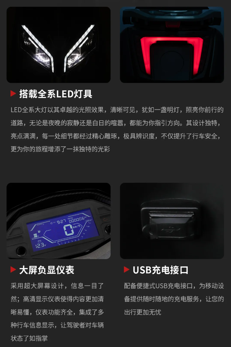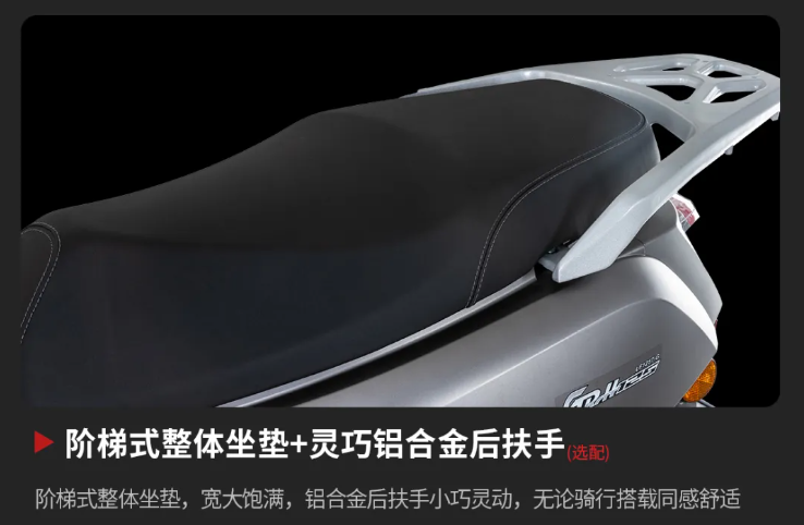 力帆 GRH125 配备手把坡道驻车制动、真空胎 / 铝合金轮毂、中置物箱、静音边撑,以及阶梯式整体坐垫 + 铝合金后扶手;同时该车还搭载全系 LED 灯具、大屏负显仪表、USB 充电接口、前置物箱等。