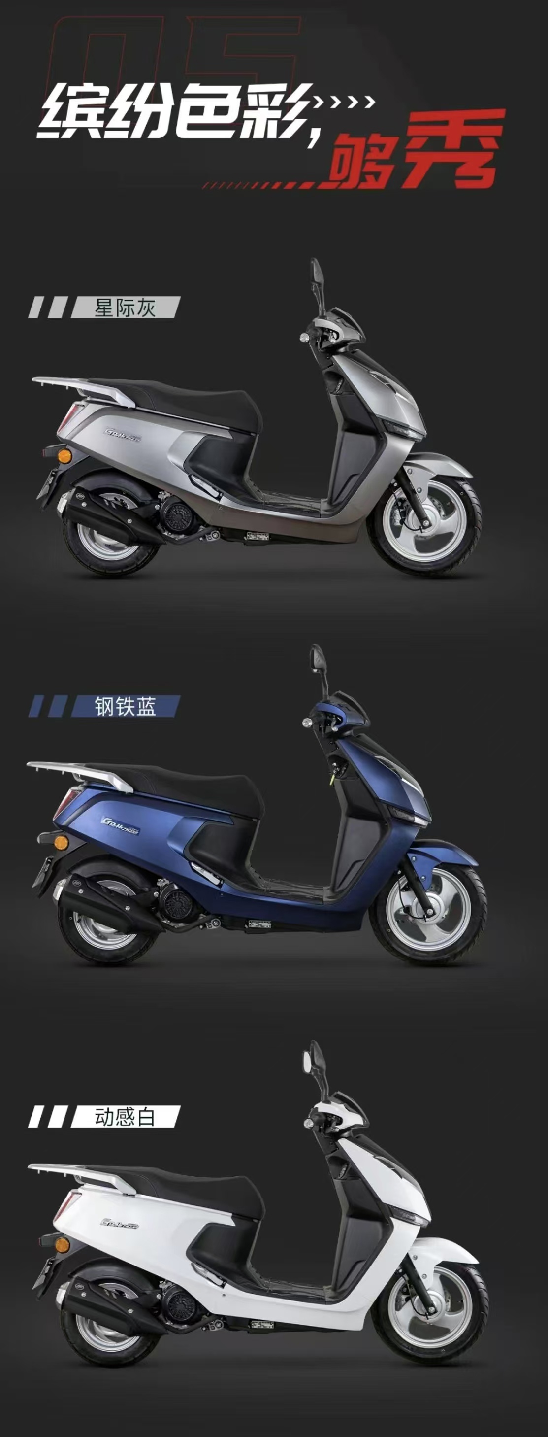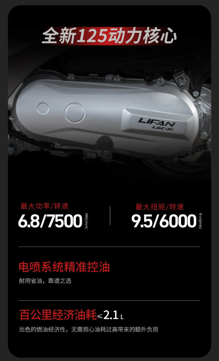 该摩托采用 125 动力核心,最大净功率 / 相应转速为 6.8 / 7500 kW(r/min),最大扭矩 / 相应转速为 9.5/6000 N・m(r / min)。该车采用电喷系统控油,百公里油耗≤2.1L。