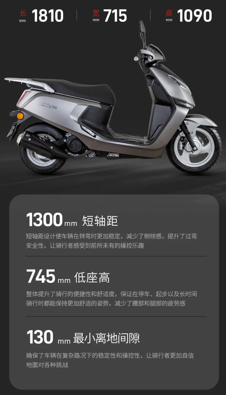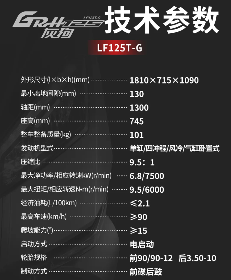 据介绍,力帆 GRH125 灰狗摩托车尺寸为 1810×715×1090mm,拥有 1300mm 短轴距和 745mm 低座高,最小离地间隙 130mm。