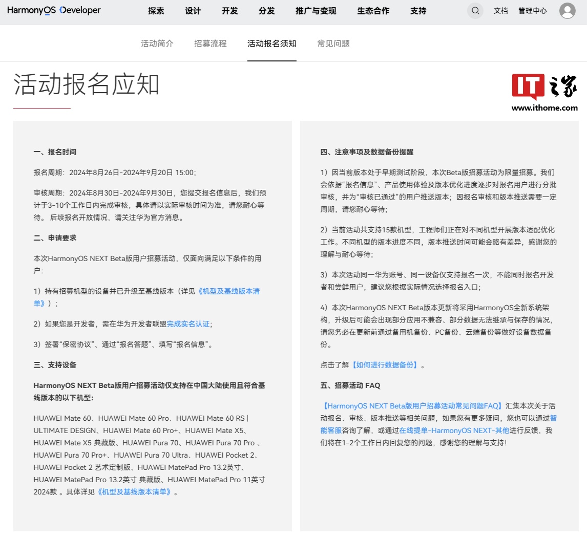 IT之家注意到,华为鸿蒙 HarmonyOS NEXT Beta 版用户招募活动报名时间作出调整,原定报名周期为 2024 年 8 月 26 日-2024 年 9 月 13 日 15:00,现延长至 2024 年 9 月 20 日。用户提交报名信息后,预计于 3-10 个工作日内完成审核。