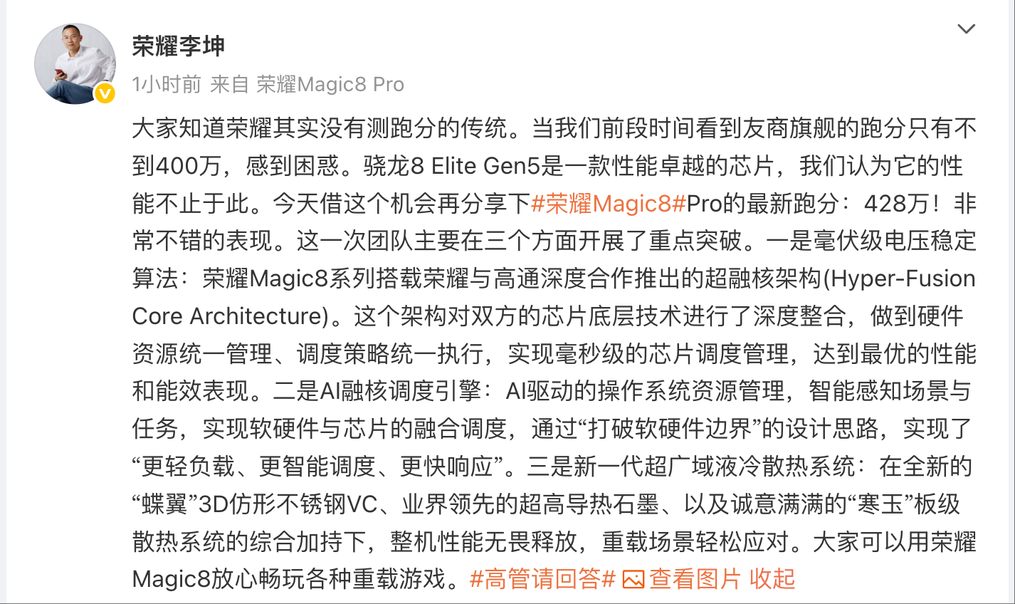 凤凰网科技讯 10月14日,荣耀终端股份有限公司旗舰手机产品经理李坤发文称,荣耀Magic8 Pro的最新跑分是428万。
