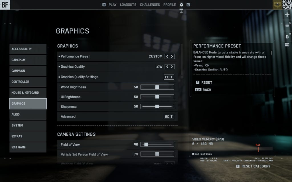 接下来,滚动到图形>相机设置。你需要将三个滑块都设置为零:武器运动模糊、世界运动模糊和相机抖动量。这样可以减轻处理器的负担,让你的系统专注于处理帧中更重要的部分,比如你的敌人。